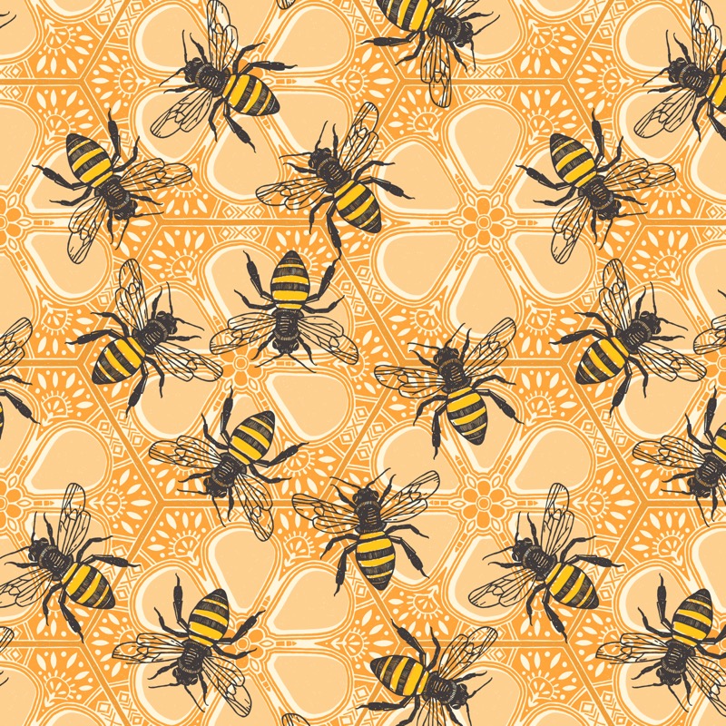 Originally drawn in ink, hive inspired floral bee pattern in a wood block style. Repeat pattern file available.