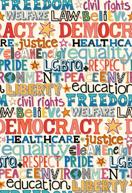 Keywords: America, believe, civil rights, clean energy, democracy, education, Environment, equality, Freedom, healthcare, justice, law, LGBTQ, LGBTQ+, liberty, Pattern, peace, politics, sharon turner, Typography, USA, welfare