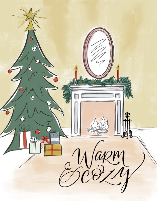 Warm and cozy Reference 41707 Version 1 Collection(s) Christmas Orientation Portrait Keywords: Christmas, Fireplace, Home, illustration, presents, Seasonal, Text, tree